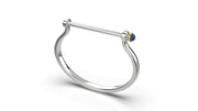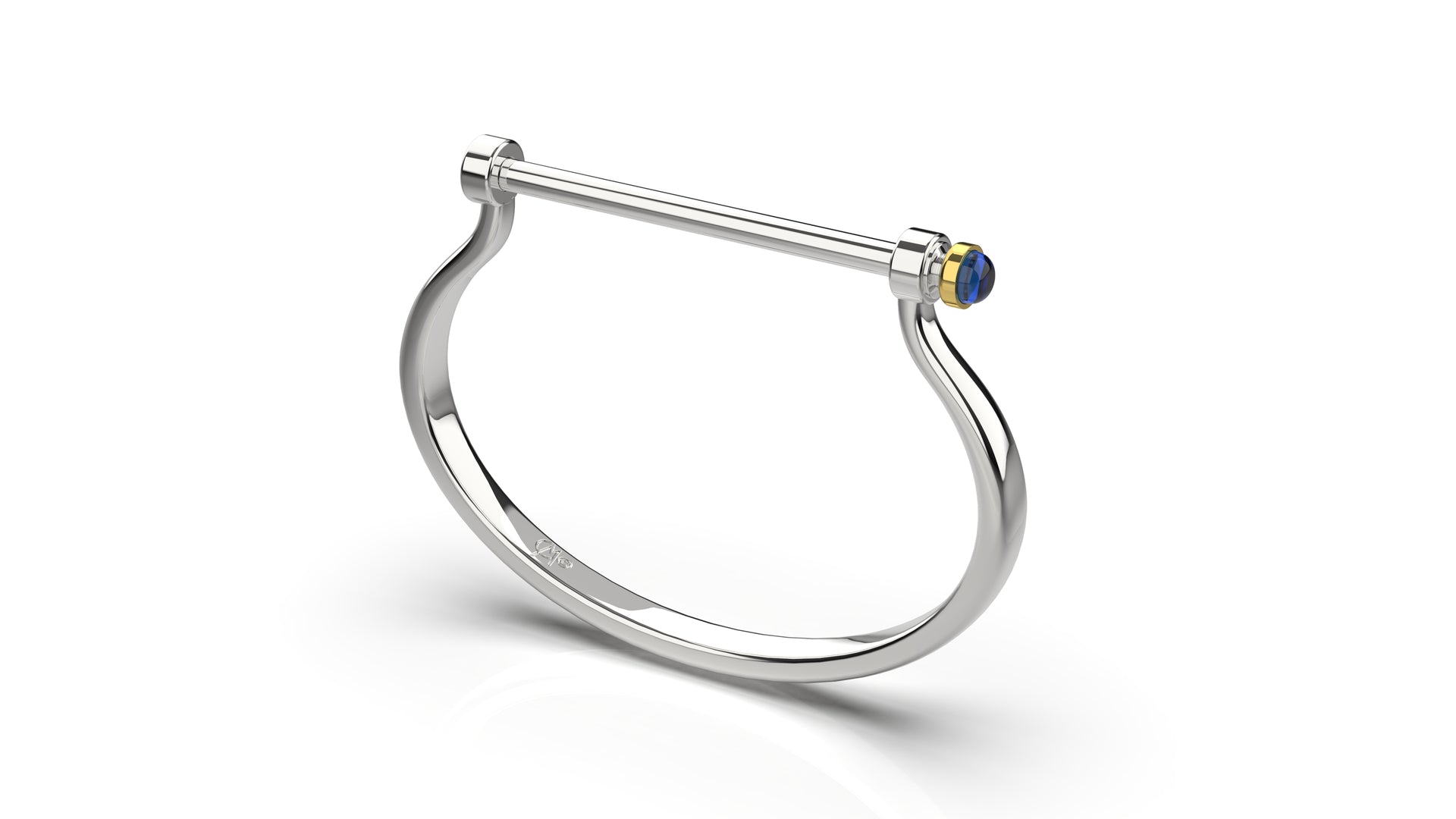 Ladies sterling silver shackle bracelet with 14K yellow gold bezel holding a 1/2 ct. vibrant blue sapphire cabochon on the end of the screw down shackle pin closure.