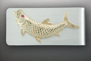 14K yellow gold Tarpon on a sterling silver money clip. Tarpon holds a .02ct.  Ruby eye. Measures 1.0" high by 2 1/8" wide.