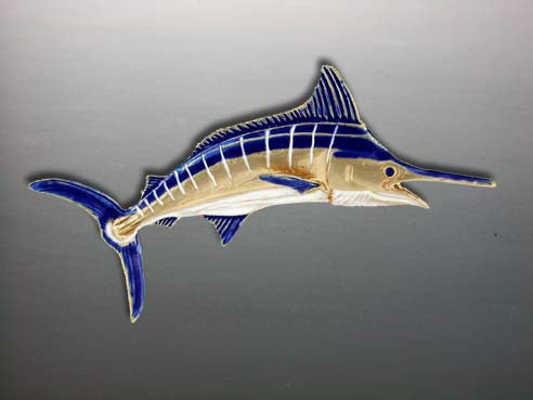 14K Yellow Gold Enameled Blue Marlin Pendant with .02ct. Sapphire eye. Measures 3.0" wide with hidden bail on back. Comes in half round only (not finished on back side of piece). All items are custom made in the U.S.A.