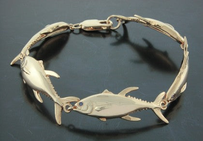 14K Yellow Gold Multi YellowFin Tuna's Bracelet with .01ct. Sapphire eyes. Comes in a ladies standard 7.5" length with a lobster claw clasp. All items are custom made in the U.S.A.