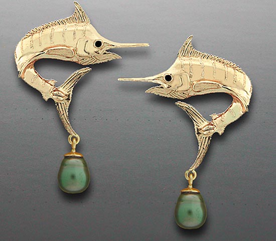 14K yellow gold Marlin post earrings with.01ct. sapphire eyes and 5.0mm dyed black pearls. Measures 5/8" wide Available in Yellow or White Gold All items are custom made in the U.S.A.