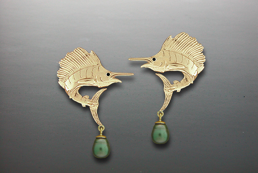14K yellow gold Sailfish post earrings with .01ct. sapphire eyes and 5.0mm dyed black pearls. Measures 5/8" wide. Available in Yellow or White Gold All items are custom made in the U.S.A.