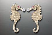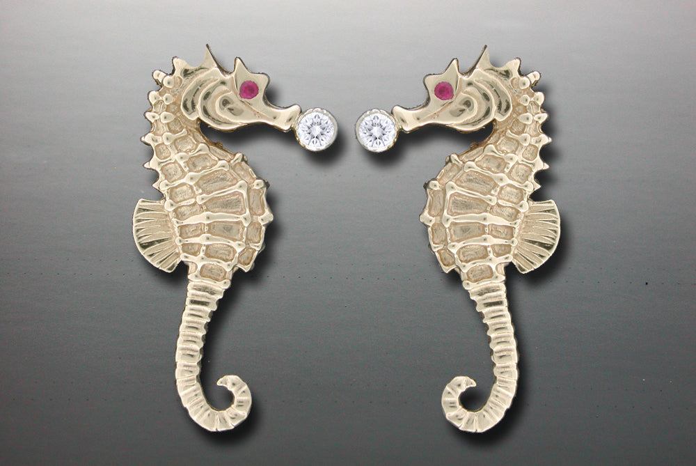 14K Yellow Gold Seahorse Post Earrings with .01ct. ruby eyes and .10ct. diamonds set in bezels. .20ct. total diamond weight. Measures 1.25" Long. Available in Yellow or White Gold All items are custom made in the U.S.A.