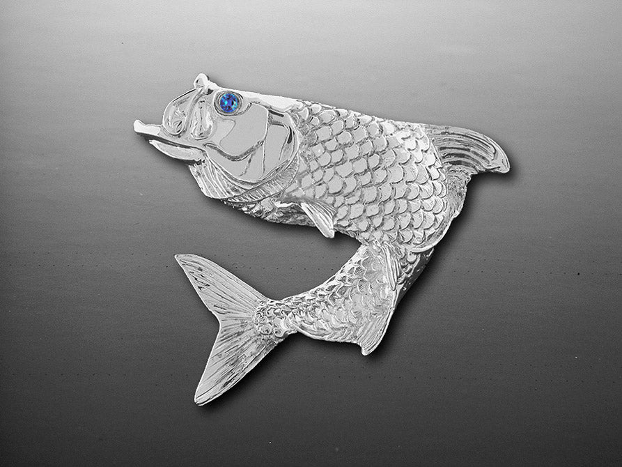 Sterling Silver Large jumping Tarpon Pendant with .03ct. sapphire eye. Offered half round (detail one on side). Measures 2.0" wide and 1.5" high.