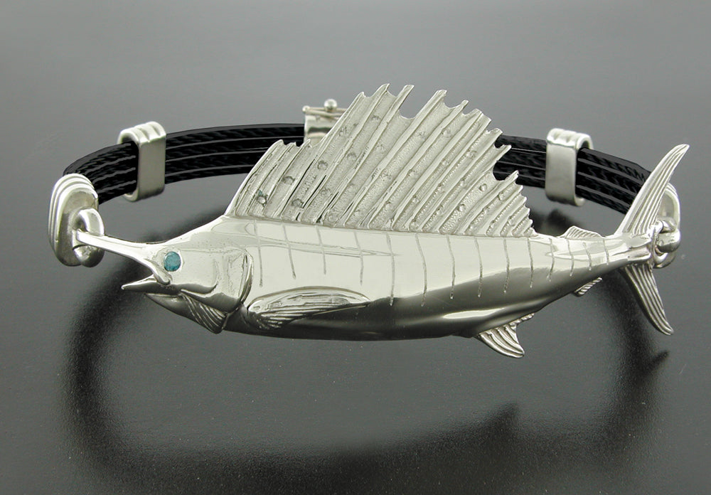A stunning silver sailfish is complemented with a captivating blue sapphire eye. As a customer-favorite, the handsome leather cord make this men's bracelet both masculine and completely wearable. Casual luxury at its finest. Makes a bold statement and perfect gift.