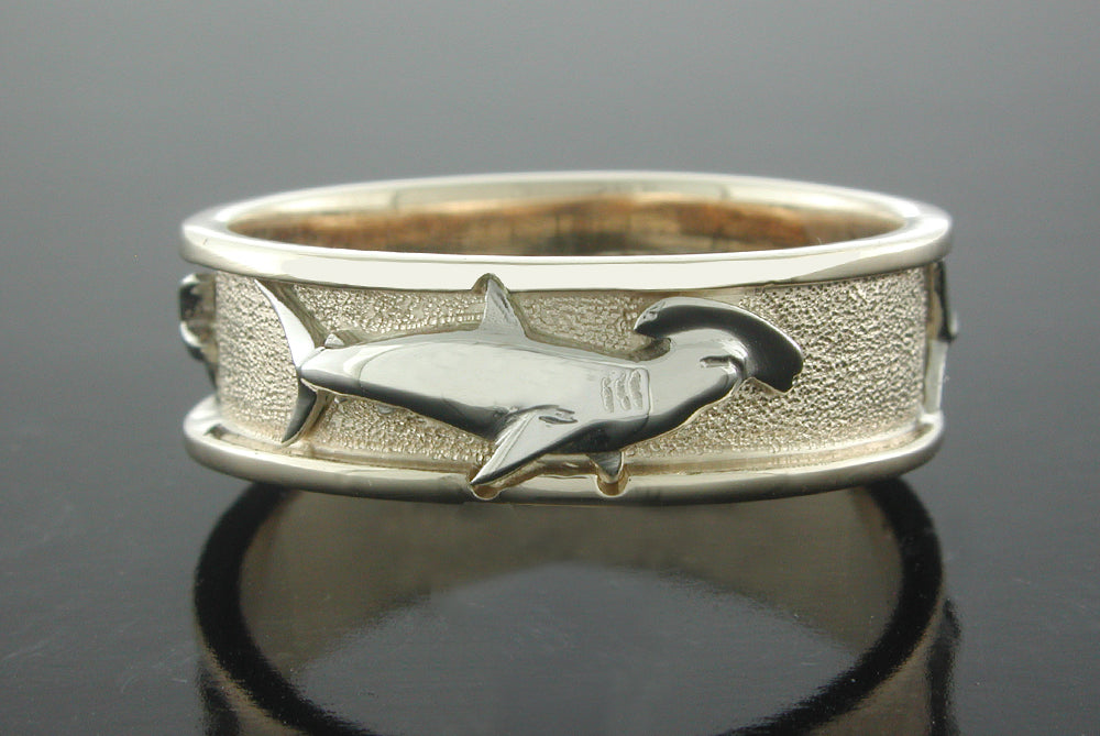 Example ring shown: 14K yellow gold band with white gold Hammerhead Shark set with .01ct. blue sapphire eyes.