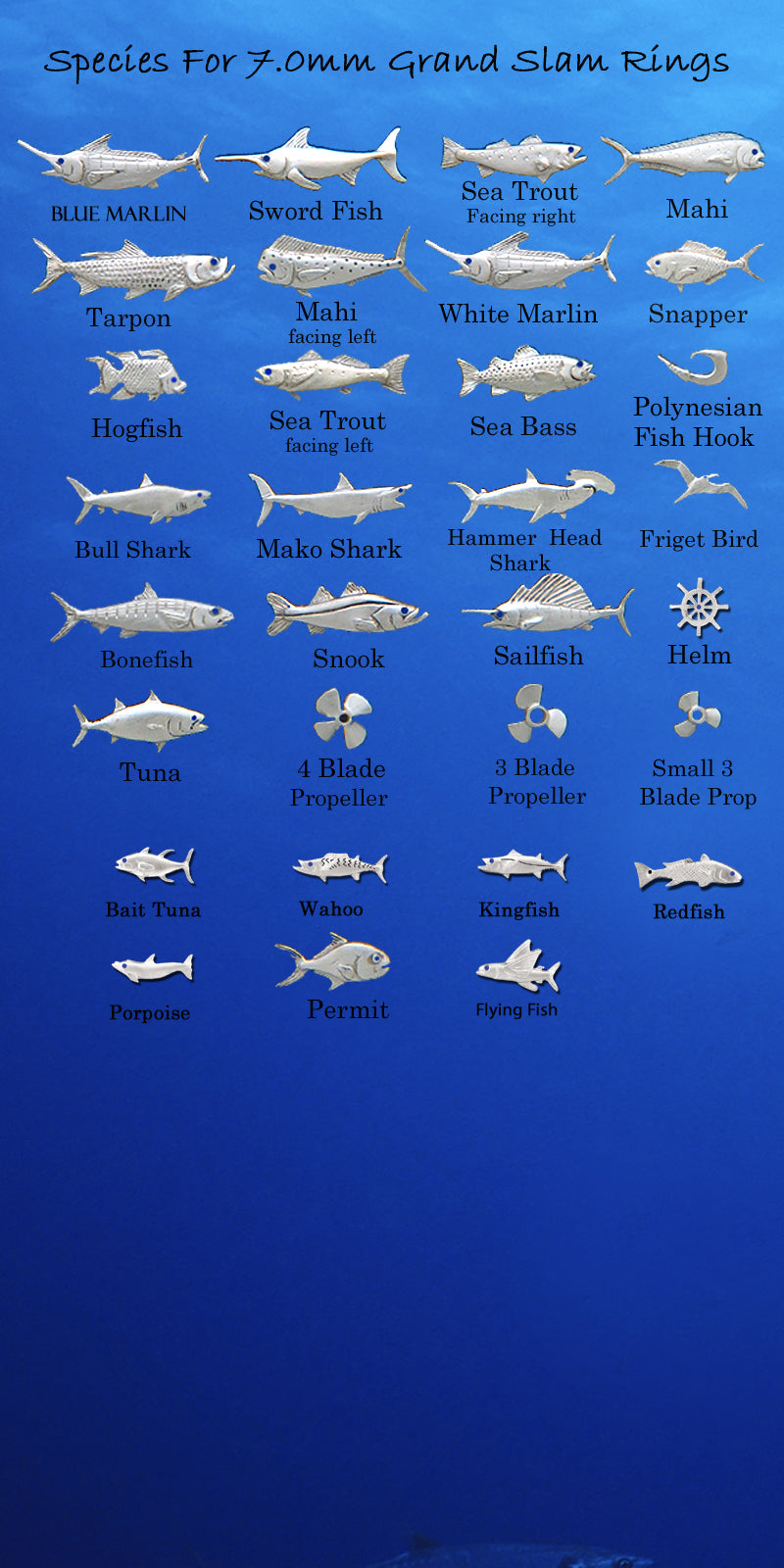 Customize your own 7mm Grand Slam Ring. You choose the details; we make it 100% personalized. Create your unique combination using your favorite sportfish and nautical elements. Scroll through photo gallery for a chart of all possible options. Need help with your ring size? Click here for an easy ring size tool.