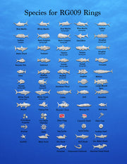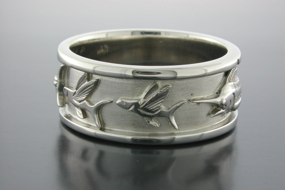 Example ring shown: 14K all white gold band and Marlin chasing Flying Fish set with no stones in eyes.
