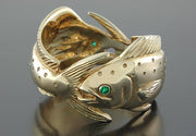 14K Yellow Gold Double Cow Dolphin Ring with .02ct. emerald eyes. Measures 9.0mm at widest point on ring. Available in Yellow or White Gold Size Chart All items are custom made in the U.S.A.