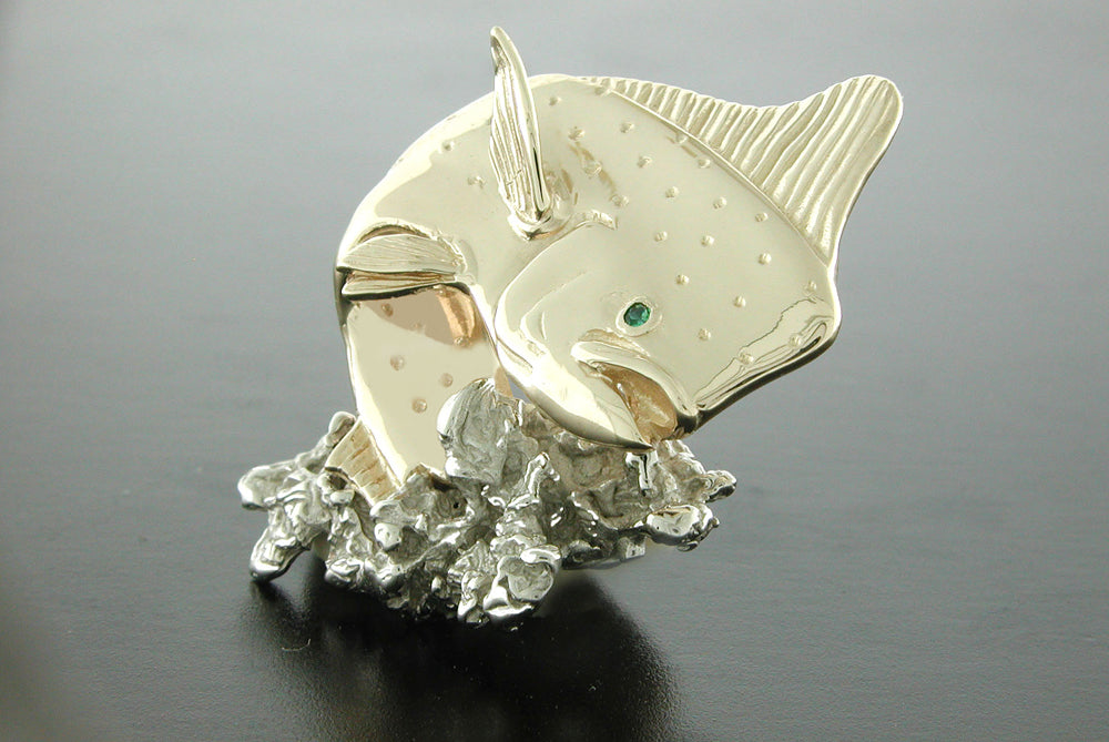 This is 14K gold rendition of artists Rick Bogert's "Furious" painting. The Mahi is 14K yellow gold with a .02ct. emerald eye and the water is 14K white gold. Offered in limited edition of 150. All items are custom made in the U.S.A.