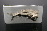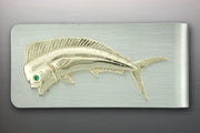 14K yellow gold mahi dolphin with a .02ct. emerald eye on top of a heavy sterling silver money clip. All items are custom made in the U.S.A.