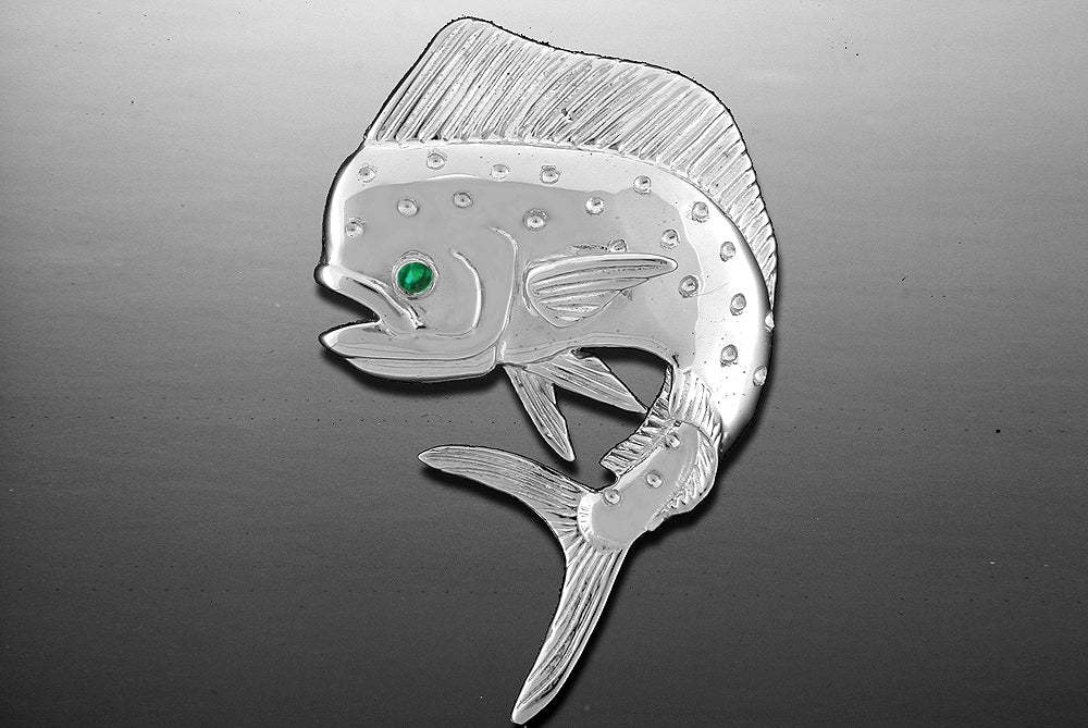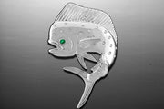 Sterling Silver Mahi Dolphin Pendant with .02ct. emerald eye. Offered half round. Measures 1 1/8" wide. All items are custom made in the U.S.A.