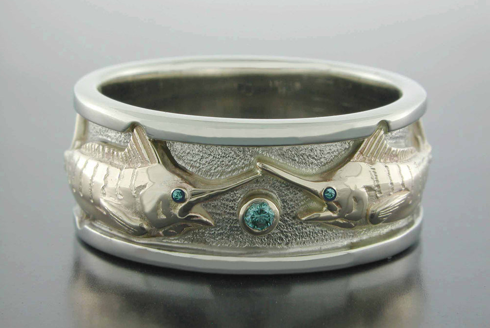 14K white gold (inner color) Grand Slam style ring with facing Blue Marlin's shown. You pick the third species for the back side of the ring. (outer color) Three .10ct. blue diamond bezel set in between. Marlin's have .01ct. blue diamond eyes.Measures 9.5mm wide. Available in Yellow or White Gold Size Chart All items are custom made in the U.S.A.