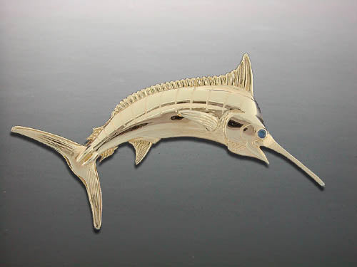 14K Yellow Gold Half Round Jumping Blue Marlin Pendant with .02ct. Sapphire eyes. Measures 2.25" long. Available in Yellow or White Gold All items are custom made in the U.S.A.