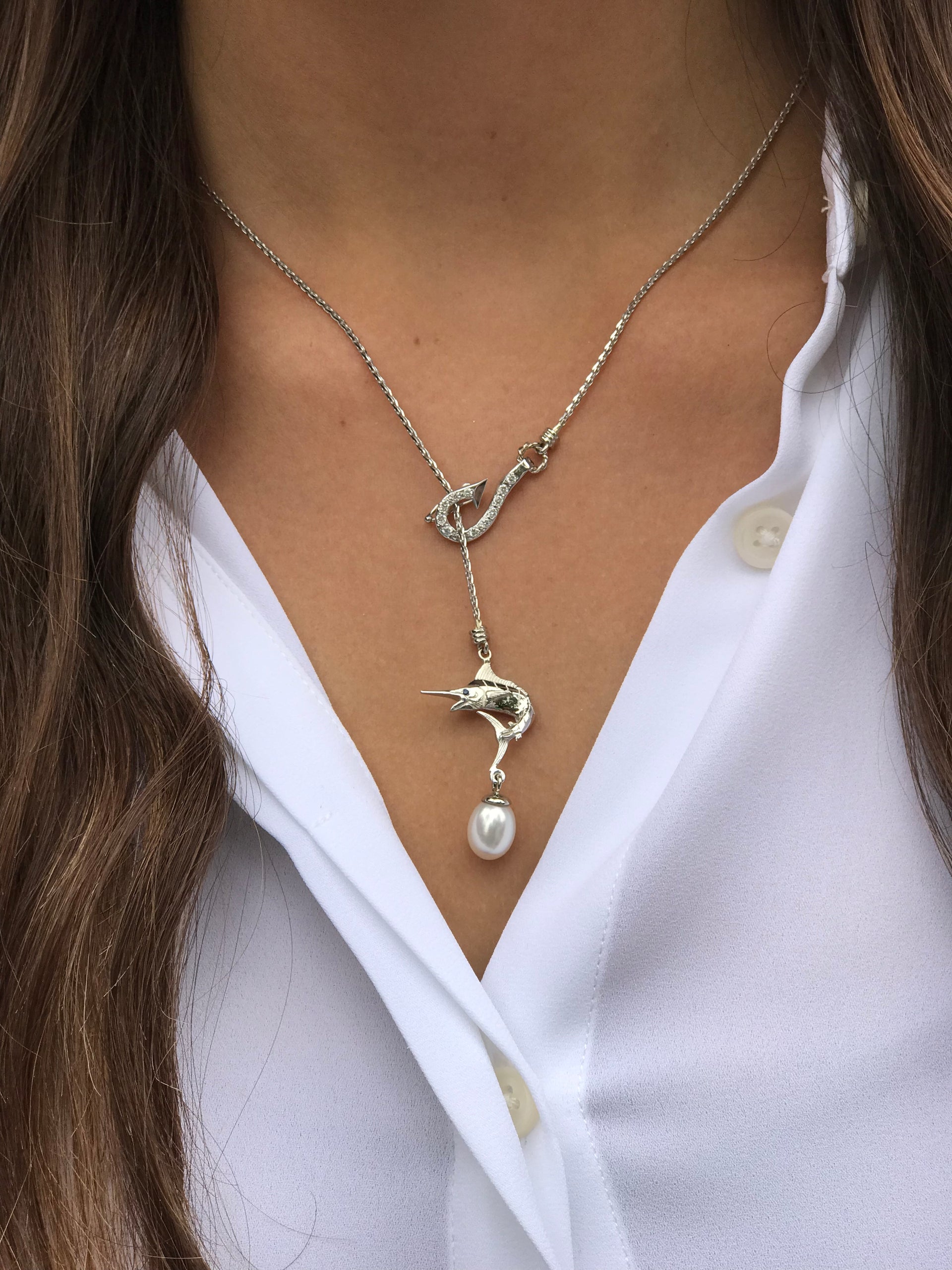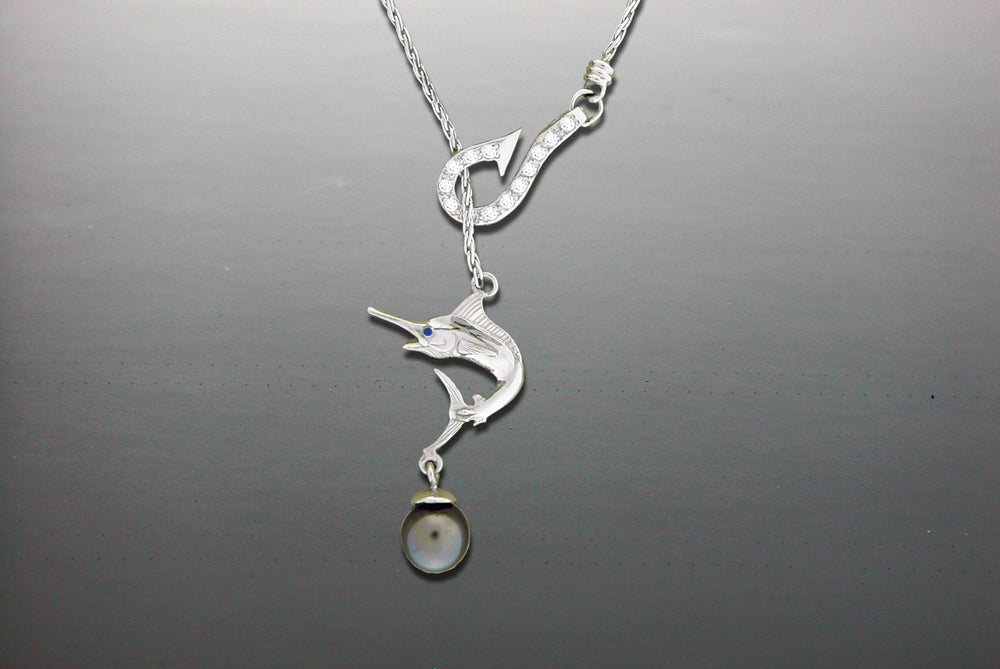 14K white gold Marlin Lariat Necklace. This necklace has .26ct. diamonds paved' in the hook that can slide up and down the necklace in order to wear at different lengths on the chain. There is a 8.0mm Tahitian Black Pearl dangling at the bottom and the Marlin has a .01ct. Sapphire eye. Overall length of chain is 18" There is a clasp on the back side of the hook working as the clasp. Marlin measures .75" wide. Available in Yellow or White Gold All items are custom made in the U.S.A.