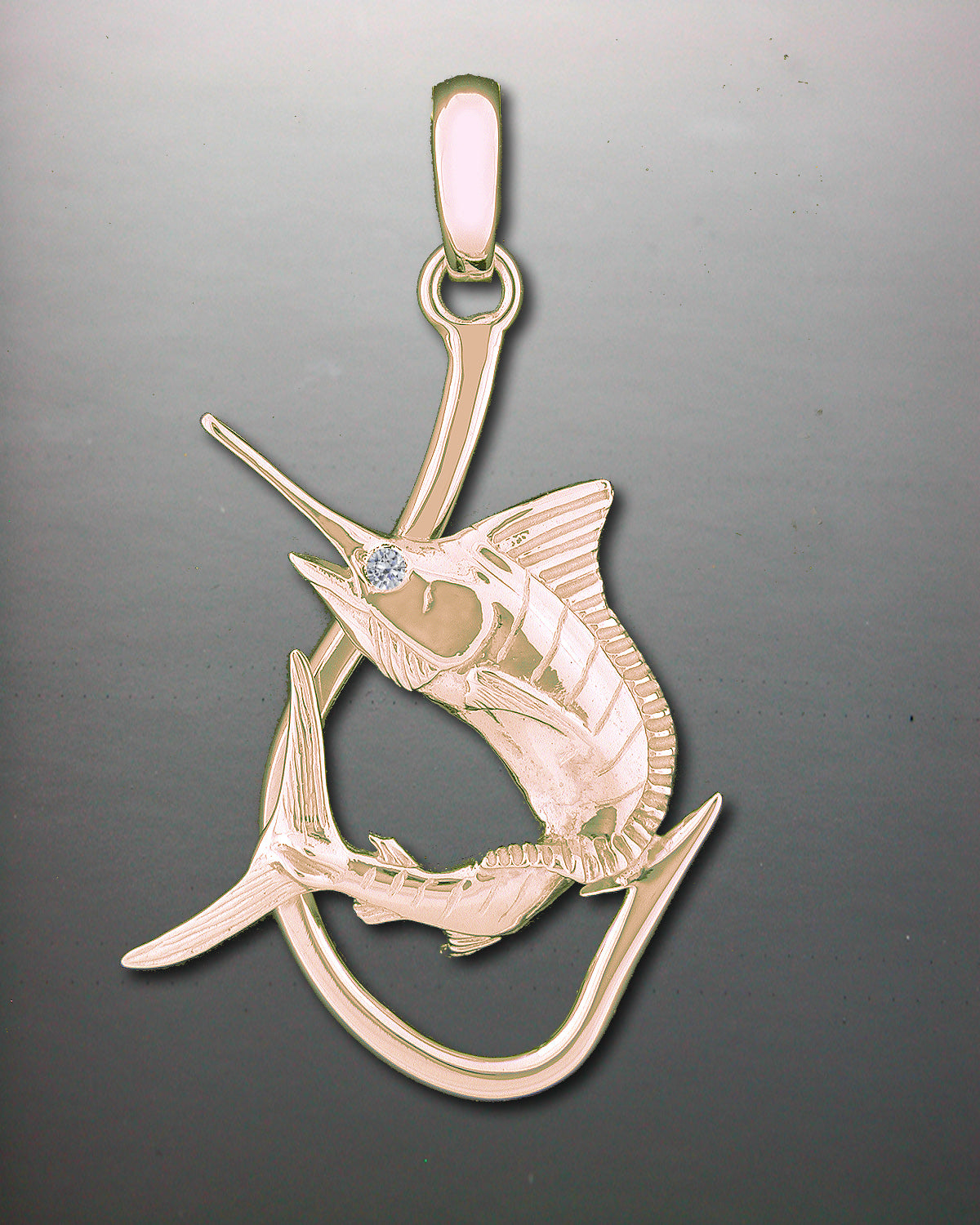 14K Yellow gold Blue Marlin in circled on fishhook pendant. Has a .05ct. diamond set in the eye. Measures 2.0" tall. Available in Yellow or White Gold All items are custom made in the U.S.A.