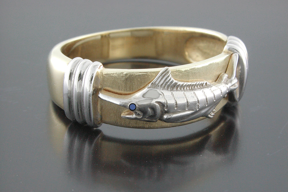 14K Yellow and White Gold Marlin Platform Ring with .01ct. sapphire eye. Ring is (inner color) and marlin and ribs are (outer color). Measures 6.0mm wide. Available in Yellow or White Gold All items are custom made in the U.S.A.