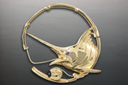 14K Yellow & White Gold Marlin Rod & Reel Pendant with .05ct. Sapphire eye. Measures 1.5" High. There is White gold fishing line with a black coral reel handle. This piece can be made into a pin or pendant or a combination of both, please inquire if needed. All items are custom made in the U.S.A.