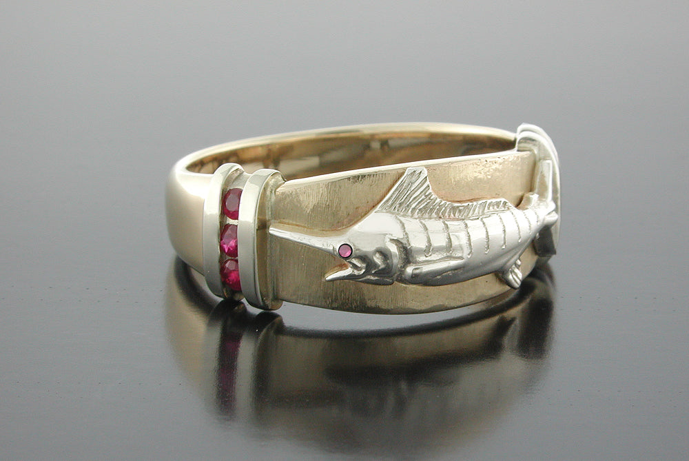 14K Yellow and White Gold Marlin Ruby Ring. There are .18ct. rubies channel set. Measures 6.0mm wide. Ring is (inner color) Marlin and channels are (outer color). Size Chart All items are custom made in the U.S.A.