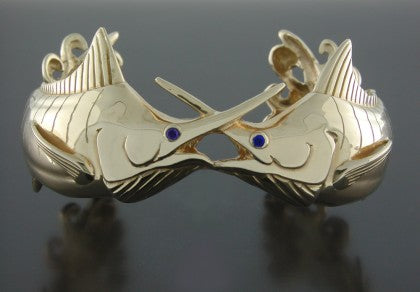 14K Yellow Gold Marlin's Cuff Bracelet with .03ct. Sapphire eyes. Fits 6.5" - 8.0" wrist sizes. All items are custom made in the U.S.A.Â
