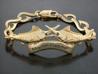 14K Yellow Gold Marlin's & Hooks Bracelet with .02ct. Sapphire eyes and engravable ribbon at bottom. Perfect for engraving Boat or special catch information on. Comes in a 8.0" wrist size. All items are custom made in the U.S.A.