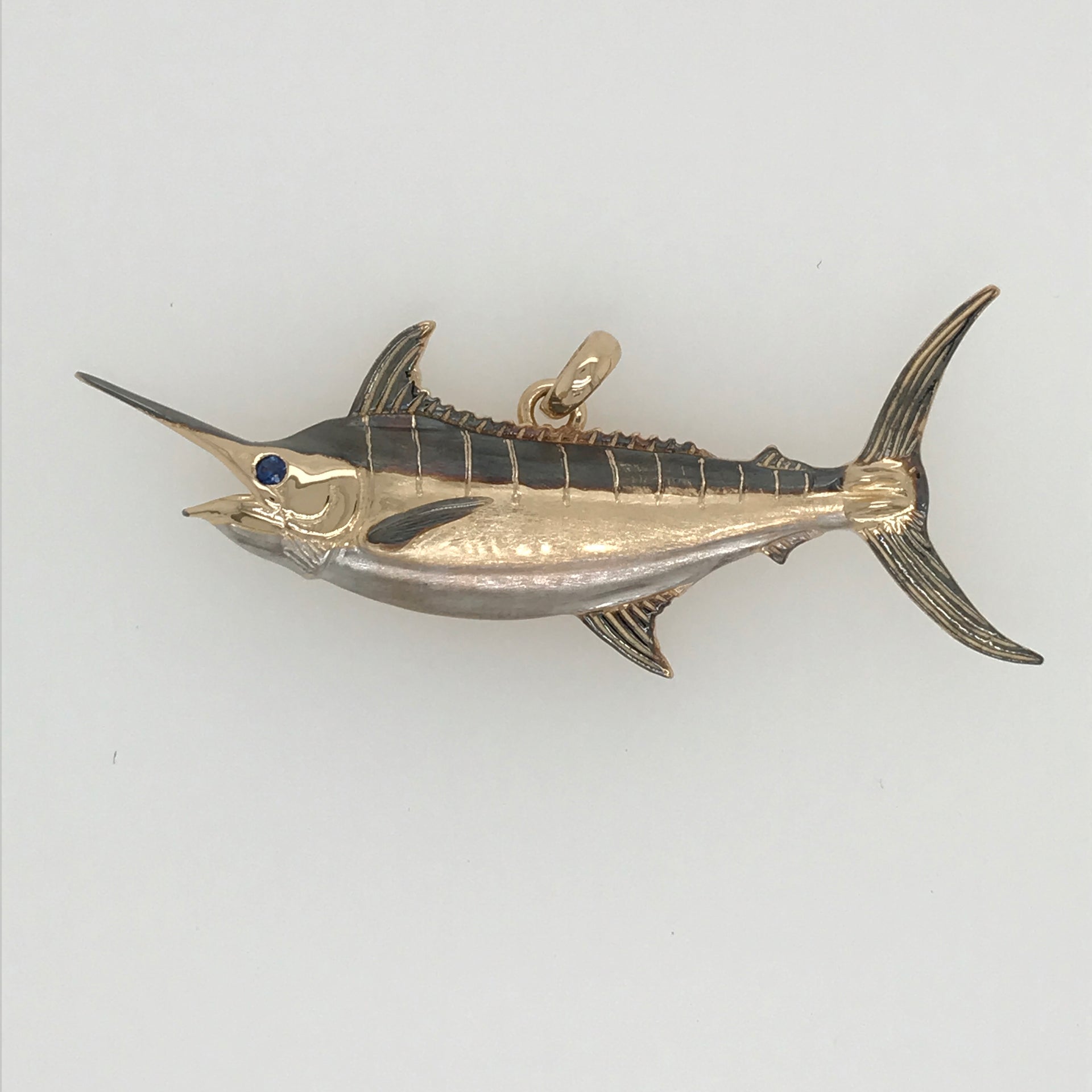 14K Yellow Gold Medium Grander Blue Marlin Pendant with black and white rhodium plating added for detail/realism. Offered in half round, detail on one side and set with a vibrate blue sapphire eye. Measures 2.25"wide.