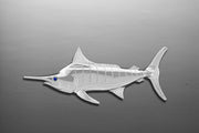 Sterling Silver Black Marlin pendant with .03ct sapphire eye. Offered half round. Measures 2 7/8" wide. All items are custom made in the U.S.A.