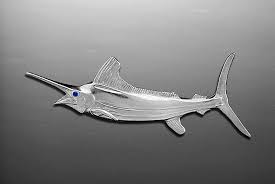 Sterling Silver Large White Marlin Pendant with .02ct sapphire eye. Offered half round. Measures 1.75" wide. All items are custom made in the U.S.A.