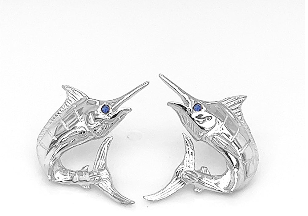 Sterling Silver Marlin stud earrings. Marlin's are set with two 1.25mm Blue sapphires in eyes and have post friction earrings backs. Measures 5/8" wide.  All items are custom made in the U.S.A.