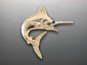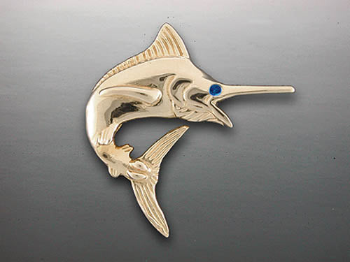 14K Yellow Gold Small Half Round Blue Marlin Pendant with hidden bail on back side and a .01ct. Sapphire eye. Measures 3/4" high Available in Yellow or White Gold All items are custom made in the U.S.A.
