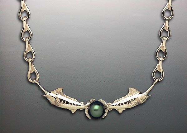 14K Yellow gold double Marlin's and hooks 17" necklace with 8.0mm Tahitian black pearl and .01ct. diamond eyes. The center piece measures 3.5" across and has a lobster claw clasp. Available in Yellow or White Gold All items are custom made in the U.S.A.