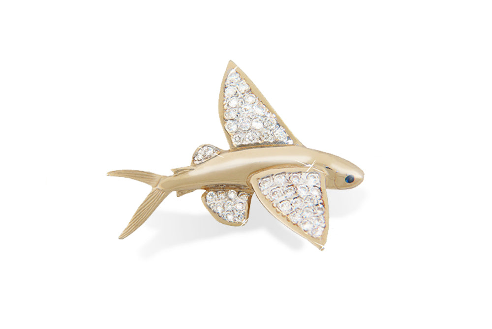 14K gold and round diamond flying fish pendant holding 1/2 ct. round SI1 in quality, G-H in color diamonds with a blue sapphire eye. Measures 1 1/8" wide.