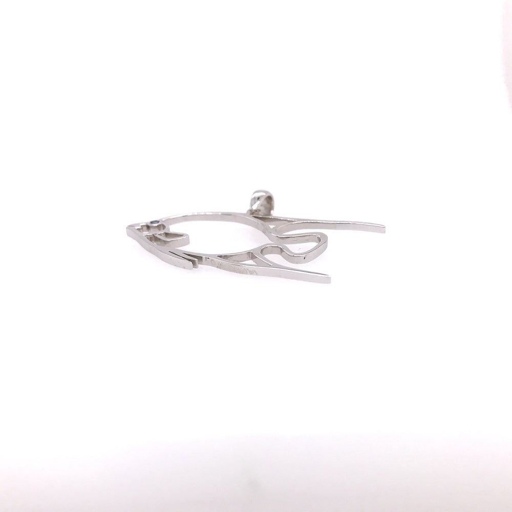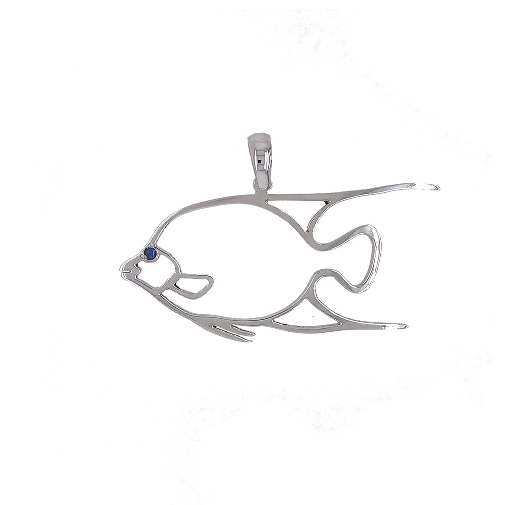 14K gold silhouette  Angel Fish pendant with a .02ct. vibrant blue sapphire eye set. Measures 1 1/4" long and weighs 2.4 Dwt. or 3.7 grams.