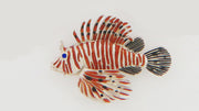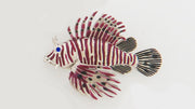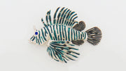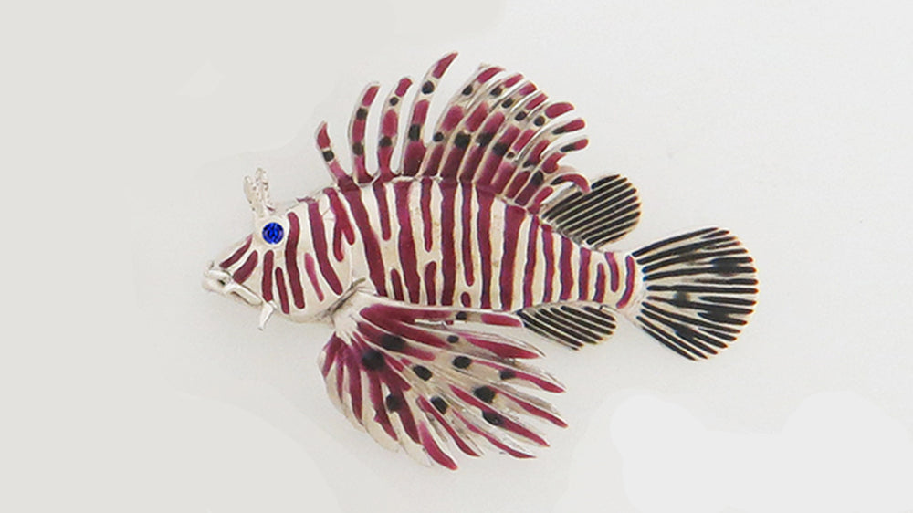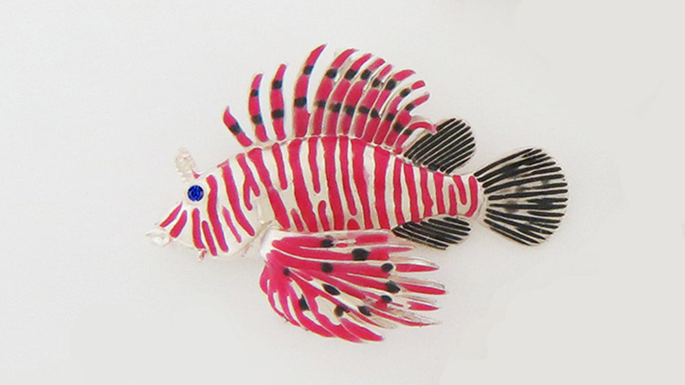 A stunning and meticulously crafted sterling silver Lionfish pendant holding a .02ct. blue sapphire eye. It's brilliantly striped fins are brought to life with colored ceramic. There is a hidden bail on the back for the chain to go through.