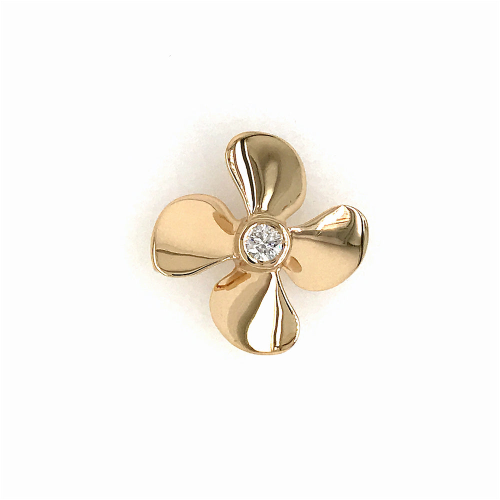14K yellow gold four blade propeller pendant holding .25 ct. round white diamond SI1 in quality and g-h in color. Measures the size of a quarter and weighs 6.2 grams.