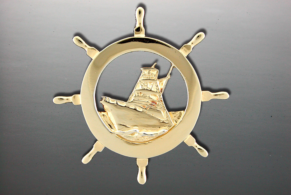 14K yellow gold helm wheel with a sportfish boat in the center. Measures 1 1/4" wide.