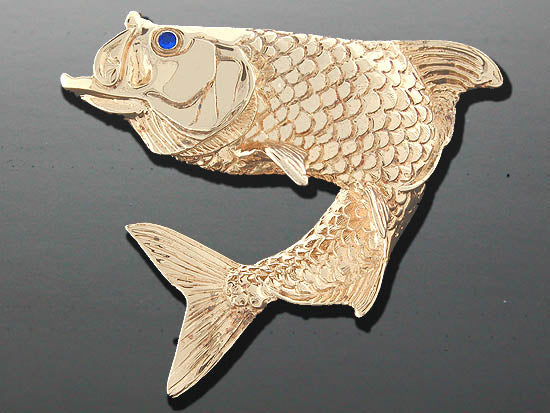 14K Yellow Gold Large jumping Tarpon Pendant with .03ct. sapphire eye. Offered half round. Measures 2.0" wide and 1.5" high. Available in Yellow or White Gold All items are custom made in the U.S.A.
