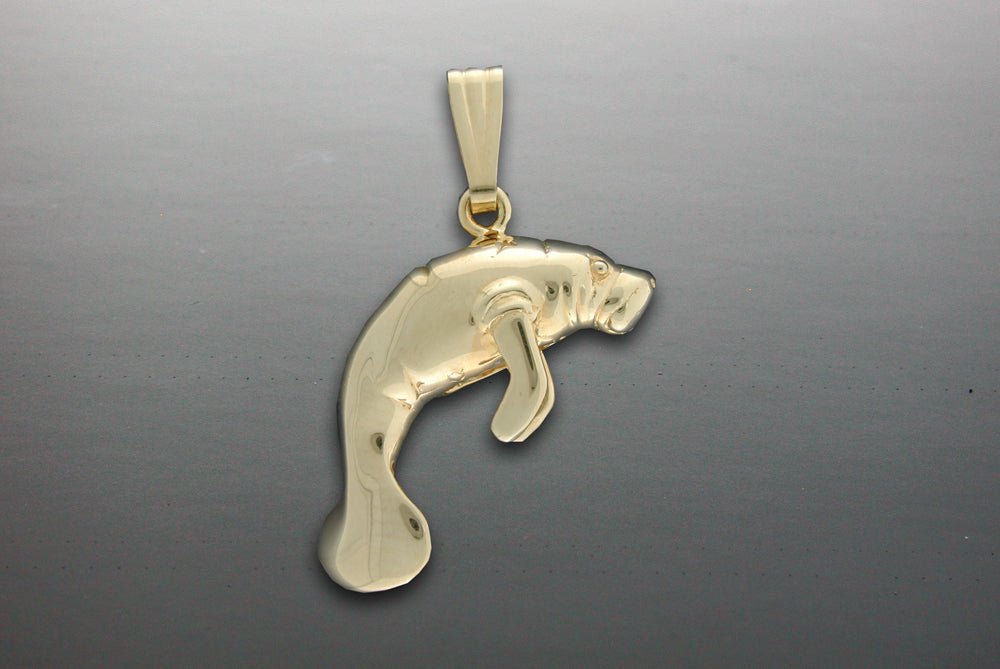 14K Yellow gold manatee pendant cast fully round. Measures 1 5/8" tall from top of bail. Available in Yellow or White Gold All items are custom made in the U.S.A.