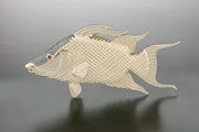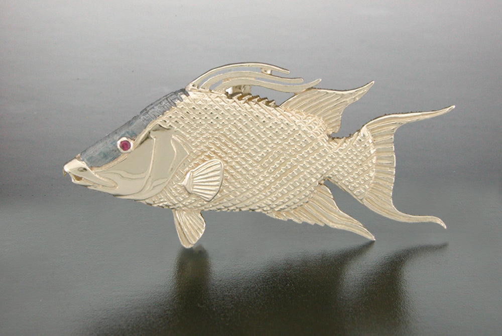 14K Yellow Gold Hog Fish Pendant with .02ct sapphire eye. Offered half round. Measures 1 3/8" wide. Available in Yellow or White Gold.