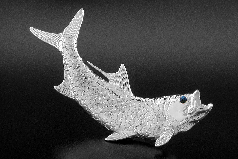 Sterling Silver large Tarpon Pendant with .02ct sapphire eye.Offered half round. Measures 1.25" wide. All items are custom made in the U.S.A.