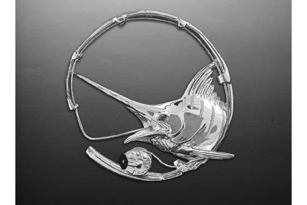 Sterling Silver Marlin Rod and Reel Pendant or Broach/Pin. Has a .05ct. blue sapphire eye and black coral handle on reel. Measures 1.25" diameter.