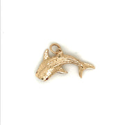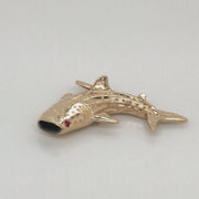14K yellow gold small Whale Shark charm / pendant set with two .01ct. vibrant ruby eyes and black rhodium plating for detail. Measures 7/8" long and weighs 4.1 grams. Would be great on a small chain necklace of hung off a charm bracelet.