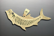 14K Yellow Gold jumping Tarpon Pendant with.02ct. sapphire eye. Offered Half round. Measures 1 5/8" wide. Available in Yellow or White Gold All items are custom made in the U.S.A.