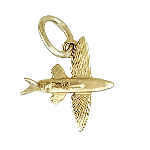 Tiny 14K Yellow Gold Flying Fish Charm 4.0mm opening jump ring. Measures 3/8" long and is offered fully round/detail on both sides. Weighs 1.5 grams.