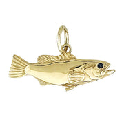 Tiny 14K Yellow Gold Grouper Charm with .01ct. Blue Sapphire set eye and 4.0mm opening jump ring. Measures 7/8" long and is offered half round/detail on one side. Weighs 1.5 grams.