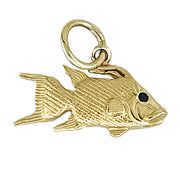 Tiny 14K Yellow Gold Hogfish Charm with .01ct. Blue Sapphire set eye and 4.0mm opening jump ring. Measures 5/8" long and is offered half round/detail on one side. Weighs 1.0 grams.