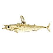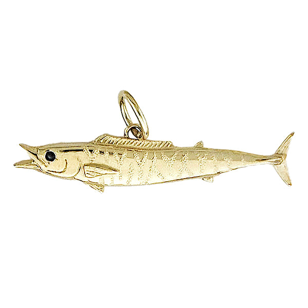 14K yellow gold Wahoo Charm with .01ct. blue sapphire set eye and measures 1 1/8" long and has a 4.0mm opening jump ring. Offered in half round/detail only on one side and weighs 1.0 grams.