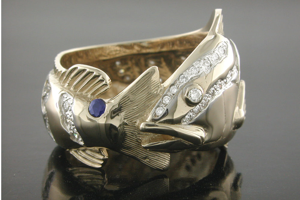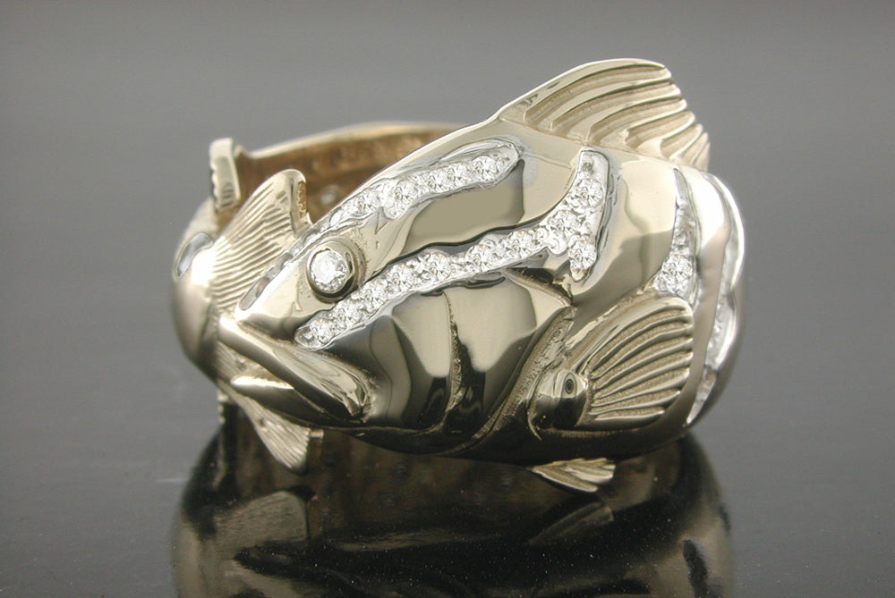 14K Yellow Gold Nassau Grouper Ring with .02ct. Sapphire tail spot and .60ct. white diamonds thoughout length of ring for natural fish coloring and realism. This ring is 12.0mm at it's widest point and comes in a standard size 10. Size Chart All items are custom made in the U.S.A.