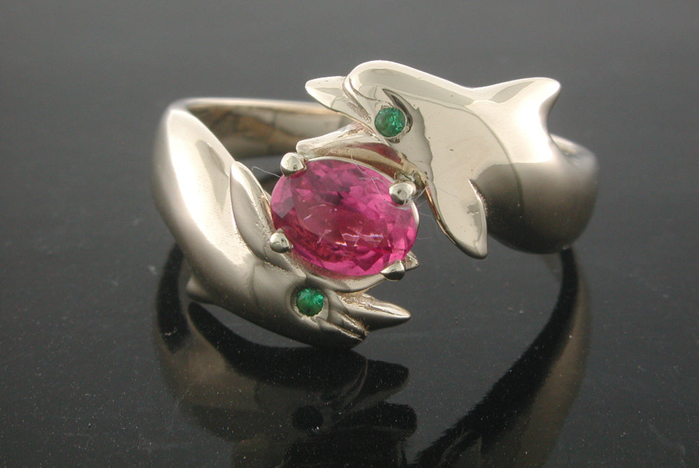 14K Yellow Gold Double Porpoise Ring with .02ct. emerald eyes. There is 5mm by 3mm pink tourmaline prong set in center. Size Chart All items are custom made in the U.S.A.