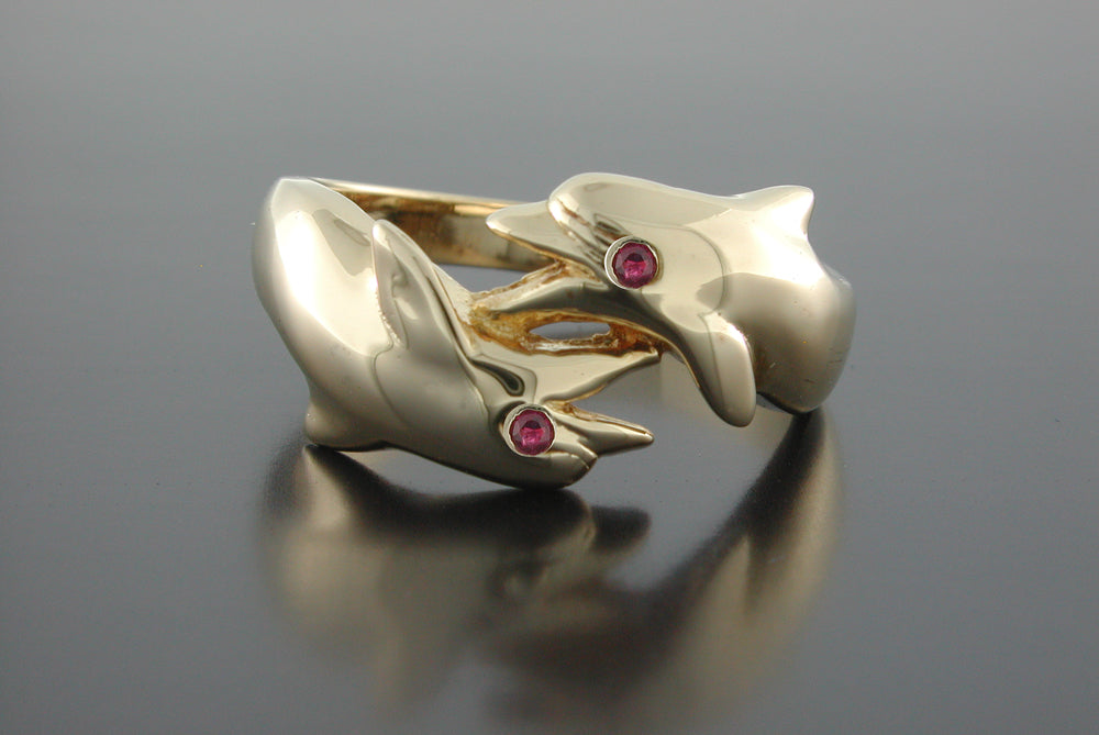 14K Yellow Gold Double Porpoise Ring with .02ct. Ruby eyes. Measures 9.0mm at widest point of ring. Available in Yellow or White Gold All items are custom made in the U.S.A.